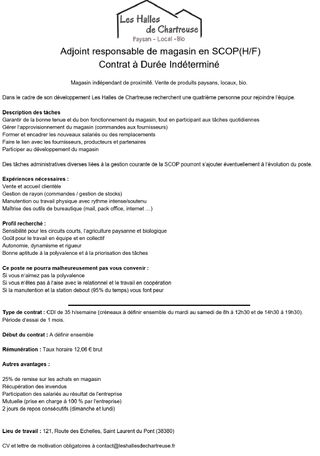 Artisanat, commerce Les Halles de Charteuse recrutent un·e Adjoint·e responsable de magasin (38) Isère - Auvergne-Rhône-Alpes (FR) Date de mise en ligne : 07.11.2025 CDI