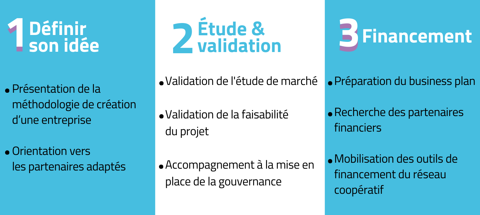 A chaque étape, notre équipe vous accompagne dans la réalisation de votre projet (Prévisionnel d’activité, montage du plan de financement, etc.). Des financements propres sont mobilisables pour renforcer l’entreprise à son démarrage et vous éviter d’engager des garanties personnelles sur les emprunts contractés. Après le démarrage, vous bénéficiez d’un suivi régulier, sans limitation de durée, et de manière renforcée la première année.